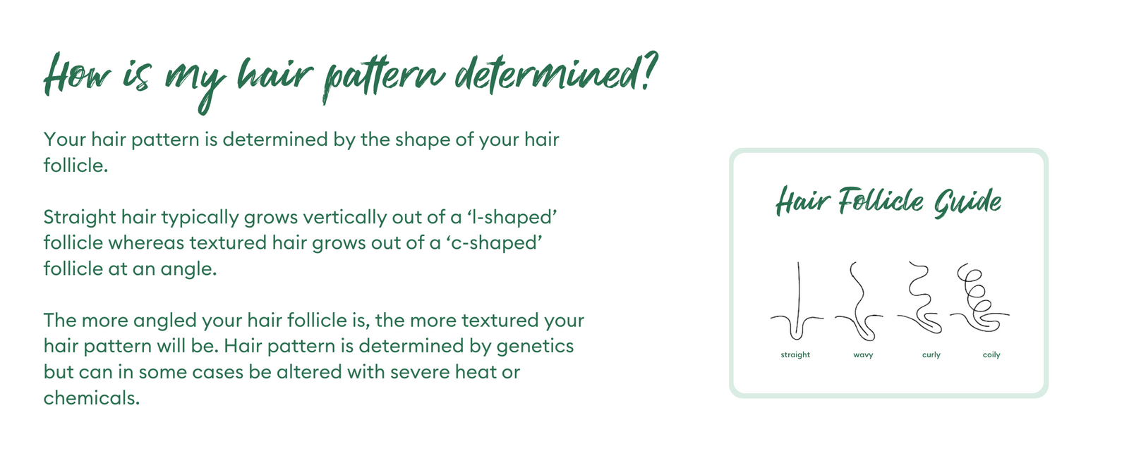 Straight hair typically grows vertically out of a ‘l-shaped’ follicle whereas textured hair grows out of a ‘c-shaped’ follicle at an angle. The more angled your hair follicle is, the more textured your hair pattern will be.